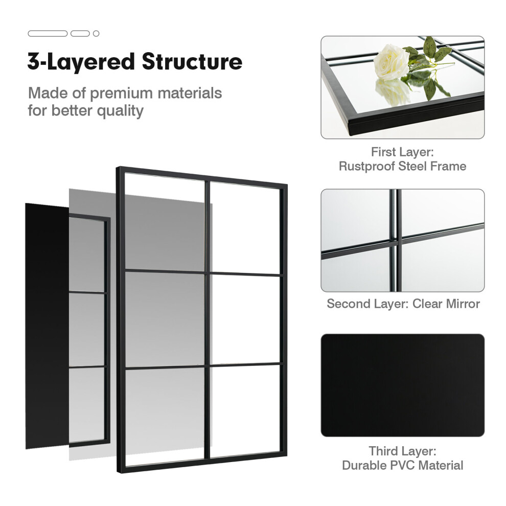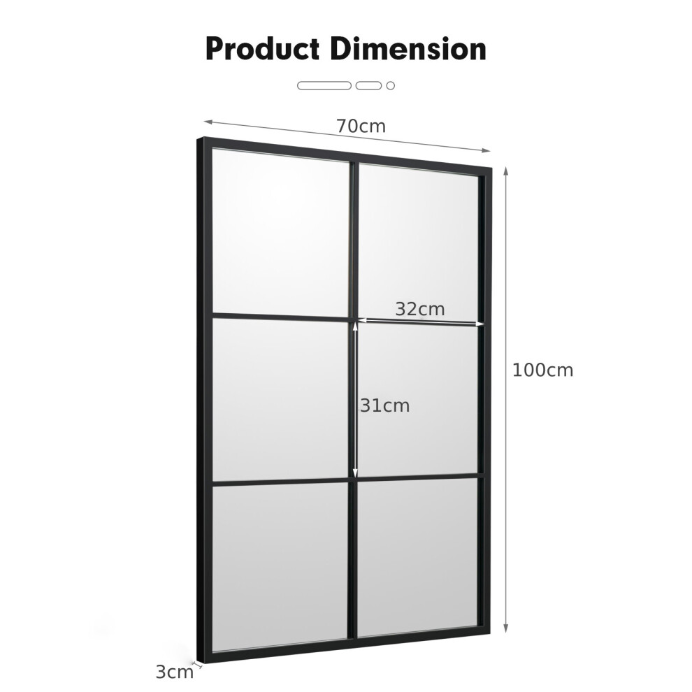 High Definition Glass: Our mirror for wall adopts high-definition distortion-free glass and presents a beautiful reflection. This decorative mirror looks have multiple panels that can easily reflect the surrounding natural light and make your home feel brighter and more spacious. And it is large enough for you to see entire figure in a single glance.Durable & Strong Metal Frame: The wall mirror is crafted with premium materials and fine workmanship for long life. It is composed of high quality metal frame, PVC panel and glass. This wall mirror is not like ordinary mirrors to fragile easily. The solid metal frame can prevent the edge of glass from being crashed.Perfect for Multiple Occasions: This decorative mirror sized of 100 x70 x 3cm (L x W x D) can be applied for nice decorations, perfect for living room, bathroom or anywhere that needs more decor. Vertical placement looks great in entryway, hallway, while horizontal display is perfect above your table, fireplace, etc. Besides wall mounting, you can lean the mirror against the wall.Easy to Install: This windowpane mirror comes with reinforced hanging holes on the back, and can be attached to the wall both horizontally or vertically. You can mount the mirror with expansion screws, or you can use a strong string to connect the two buckles and hang them on one nail.Decor Your Room: This elegant decorative wall mirror can instantly add timeless appeal to your home. Featuring a simple, clean frame in black finish, this decorative mirror serves a functional purpose and adds sophistication and light to any space. It will perfectly match with modern, contemporary or classic decor.Vintage Windowpane Hanging Mirror Wall Mounted Decoration Mirror DescriptionDescription:Adding this mirror to your home adds appeal to your space while making it appear more open!This wall mirror is made from a black metal frame, which promises strong strength and durability. The 100cm by 70cm frame surrounds a 96cm by 66cm mirror. The mirror is made to last with thick high definition glass to reflect clear image. The easy-hang holes on the back for secure horizontal or vertical mounting. This wall mirror can be placed to catch the light for a brightening effect or used as an elegant design piece to bring any room together. This rectangular mirror has a classic modern style and will add visual appeal to your room. Its sleek, clean lined frame has a classic finish and accentuates any decor. This mirror can enhance the look and feel of any room.Features:Quality thick glass mirror backed by PVC panel for longevity and durabilityDurable black metal frame ensures stability while also adding modern appealHigh definition glass with reflective surface can make space look larger and brighterMultiple panels well reflect the light and help your space more openIdeal for use as a wall mirror while serving as functional wall artPerfect for a hallway, foyer or any room that needs a touch of practical decorMount your wall mirror horizontally or vertically, or keep it lean against wallThis contemporary mirror fits in beautifully with your existing decorIncludes easy-hang holes preinstalled on the back for quick and easy mountingWipes clean with a soft, dry clothSpecification:Material: Glass, Metal, PVCOverall Dimension: 100 x 70 x 3cm(L x W x D)Glass Dimension: 96 x 66(L x W)Net Weight: 8kgPackage Includes:1 x Wall MirrorFeaturesColour:BlackType:Wall MirrorShape:RectangularMounting:Wall MountedFeatures:NoneMaterial:GlassFrame:With FrameProduct TagsHanging, Vintage, Hanging Mirror
